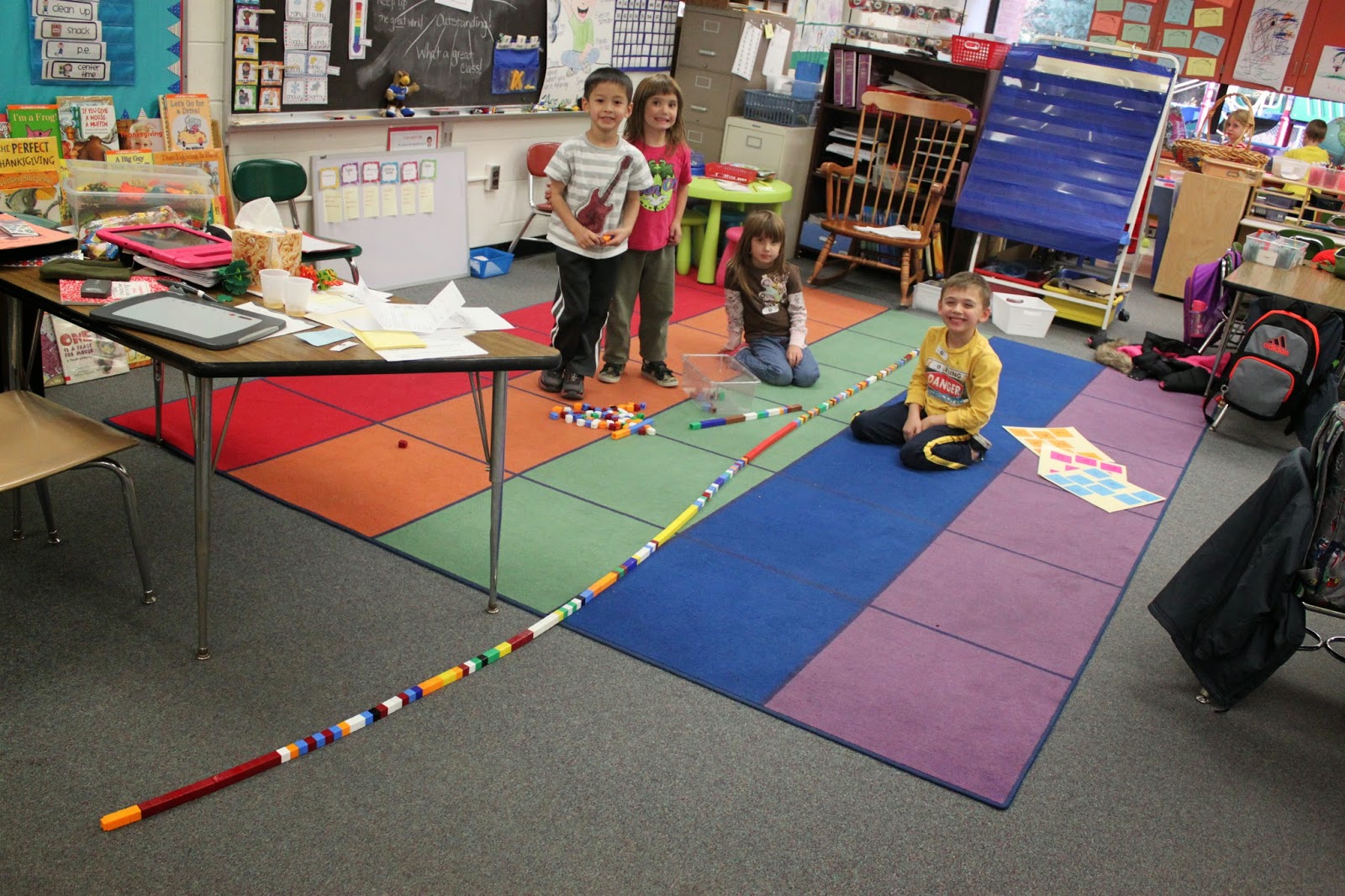 In Math on Thursday, we measured our names, the supply cups, our chairs and tables and then... the rainbow carpet. 146 cubes!