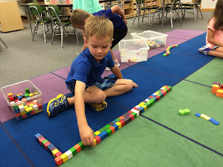 Our Math block is full of number sense practice. We have used tools to represent numbers, to create sets, to play games with classmates, to practice writing numerals, to reinforce counting, to explain reasoning and to apply understanding to real life situations. We are working toward consistency, sustainability and, the big one, autonomy. It is my plan to begin some small group instruction in two weeks as the Kinders learn to maintain attention to and sustain their endurance for tasks without my direct guidance as they work in small groups.