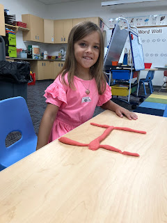 These first pictures are from the staggered start days. We read The Line Up Book and then practiced lining up some of our math manipulatives. We also made play-dough to introduce one of our Standards of Mathematical Practices, attendance to precision. If we did not measure the ingredients correctly, the play-dough did not turn out with the proper consistency and wasn't any good to use! We drew self portraits and wrote our names to decorate our blue folders. We visited all of our Specials teachers. We learned about Application Centers and practiced using some of those materials. We practiced reading on the carpet and discussed the expectations for reading quietly and for building our Read-to-Self stamina. We also met our high school intern, Miss Madison.